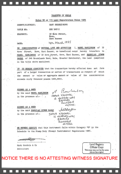 THE LAND REGISTRY HAVE FAILD TO RECONIZE THEIR MISTAKE IN REGISTERING THE TRANSFER IN 1995 IN FACT BEFORE THE 1st AUGUST 1995 THE TRANSFER REQUIRED TWO ATTESTING WITNESSES WITHOUT WHICH THE TRANSFER IS VOID IN THIS CASE THERE WASN'T EVEN ONE WITNESS PRESENT TO ATTEST SO IT WAS A FRAUD he and his soliciror used Sagar's sister printed name!!!